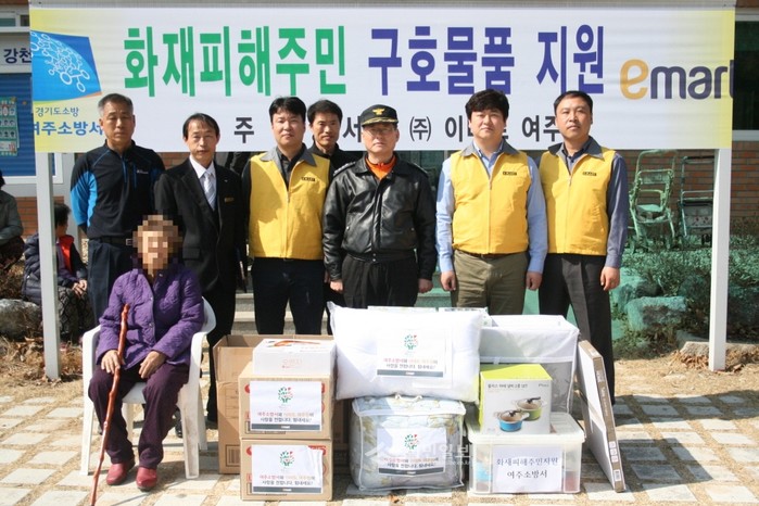 19일 경기 여주소방서는 이마트 여주점과 함께 지난 7일 발생한 주택화재로 생활터전을 잃어버린 화재피해주민에게 침구류 등 생활필수품을 강천1리 마을노인정에서 전달했다. (사진제공=여주소방서)