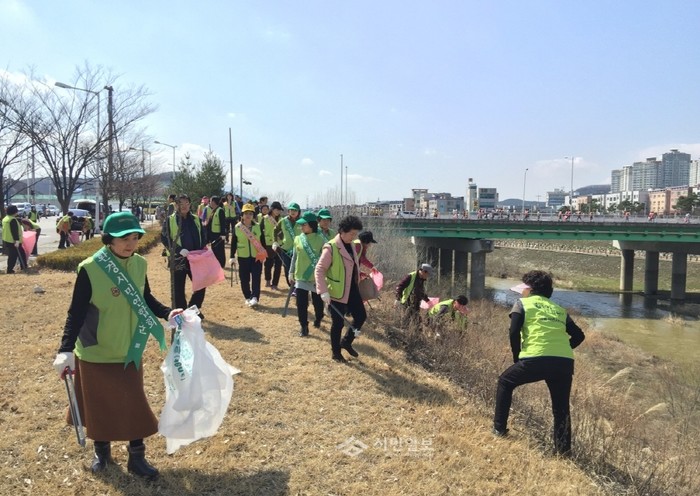 경북 구미시가 19일 세계 물의 날을 기념해 하천 정화 활동을 실시했다. 이날 행사에는 구미시 근로자 문화센터에서 기업체 및 시민단체 400여명이 참석해 한천 주변 3.8km에서 하천 정화 활동을 펼쳤다. 사진은 행사에서 참여자들이 하천 정화 활동을 펼치고 있는 모습. (사진제공=구미시청)