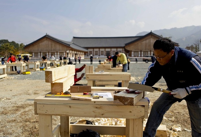 | ▲ 2013년 개최된 한옥기능경기대회에서 한옥관련 기술인 참가자가 톱질을 하고 있다. | ||