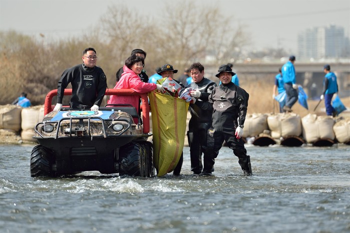 지난 20일 서울 송파구가 ‘세계 물의 날’을 맞아 탄천 생태경관보전지역에서 실시한 ‘환경정화 활동’에 참가한 박춘희 송파구청장이 '대한민국 특전동지회'와 함께 탄천 광평교 부근에서 수중정화작업을 펼치고 있다.(사진제공=송파구청)
