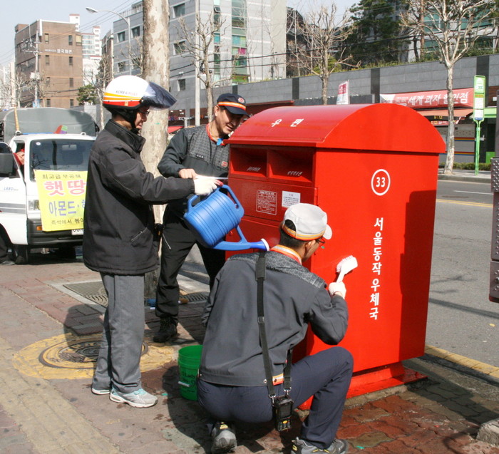 서울지방우정청 서울동작우체국 집배원들이 20일 오전 지역내 거리에 설치된 우체통의 먼지를 닦아내고 있다.