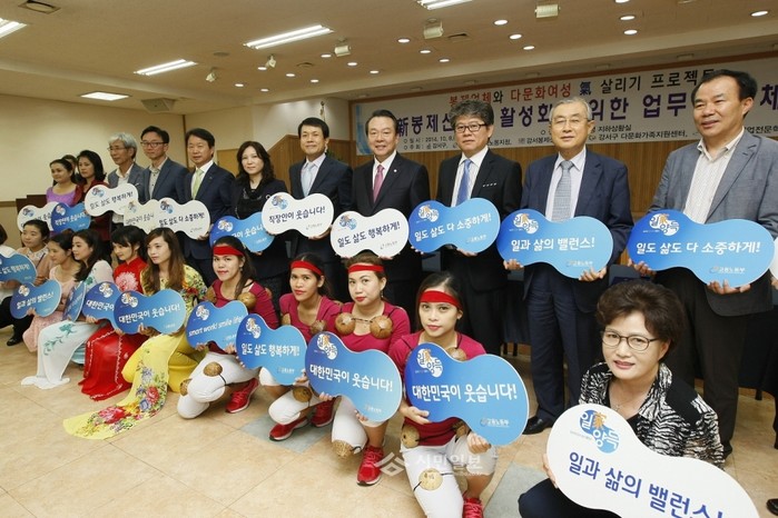 | ▲ 강서구는 인력 수급에 어려움을 겪고 있는 지역내 봉제산업체를 돕고자 결혼이민자 및 북한이탈주민 등을 대상으로 '봉제기능공 양성과정'을 실시하고 있다. 사진은 지난해 봉제산업 활성화를 위한 업무협약식에서 노현송 구청장(윗줄 가운데)이 관계자들과 기념촬영한 모습.(사진제공=강서구청) | ||