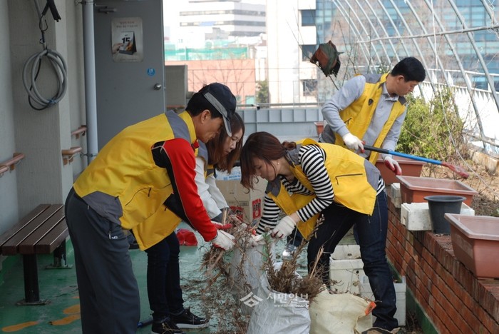 대전 대덕구 비래동주민센터는 지난 21일 성덕요양원에서 '희망나눔 자원봉사'를 진행했다. 이날 자원봉사에는 이재석 동장을 비롯한 직원 9명이 참여해 요양원 옥상 텃밭가꾸기, 환경정비 등 봉사활동을 펼쳤다. 사진은 봉사에 참여한 주민센터 직원들이 옥상을 정리하고 있는 모습. (사진제공=대덕구청)