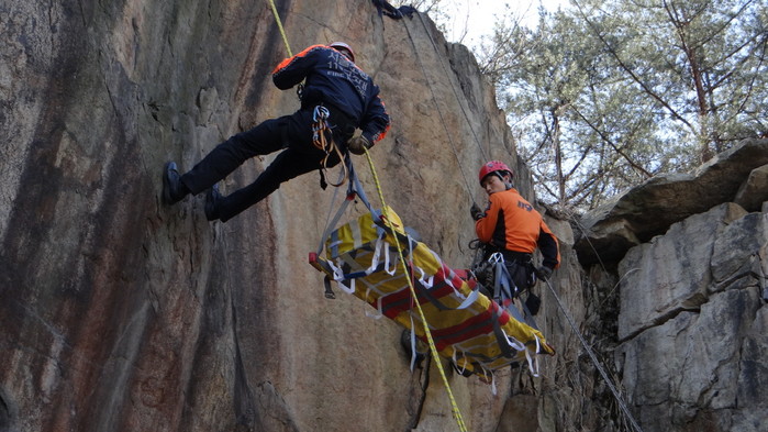 서울 관악소방서가 24일 관악산 암벽지대에서 '산악사고 대비 인명구조훈련'을 실시했다. 이번 훈련은 봄철 등산인구의 증가시기에 산악구조 숙달훈련을 통해 출동준비에 만전을 기하고자 진행됐다. 사진은 훈련에 참여한 소방관들이 들것을 이용한 구조훈련을 진행하고 있는 모습. (사진제공=관악소방서)