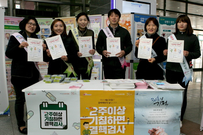 24일 오전 10시 서울 왕십리역 민자역사 중앙선 출입구에서 성동구 보건소 관계자들이 '결핵예방의 날'을 맞아 캠페인을 벌였다. 사진은 관계자들이 '기침예절 캠페인 리플릿'을 들고 캠페인을 펼치고 있는 모습.(사진제공=성동구청)