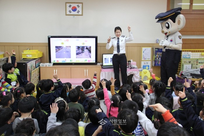 인천 서부경찰서는 25일 해원초교 병설유치원을 방문해 어린이 100여명을 대상으로 교통안전교육을 실시했다. 이날 교육에서는 교통안전 동영상 시청과 퀴즈풀기를 통해 어린이들이 지켜야 할 교통질서 학습의 시간이 진행됐다. 사진은 교육에 참여한 어린이들이 한 경찰관과 함께 퀴즈를 풀고 있는 모습. (사진제공=서부경찰서)