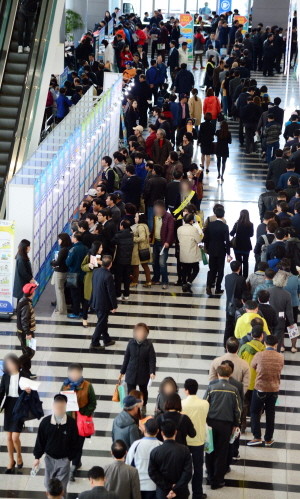 25일 오후 부산 벡스코 제2전시장에서 열린 '2015 경력직-중장년 일자리박람회'를 찾은 구직자들이 행사장에 입장하기 위해 길게 줄을 서고 있다. 이날 행사에는 150여곳의 우수기업이 참여해 경력직과 중장년층, 청년층 등 계층별로 나눠 1500여 명을 선발할 예정이다.