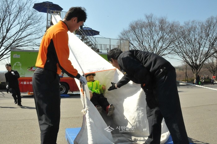동작소방서는 지난 24일 동작구에 위치한 보라매공원에서 메이플유치원 원아를 대상으로 '이동안전체험차량 소방안전교육'을 실시했다. 이는 소화기 사용법, 화재시 경사구조대 이용 탈출법, 비상구 이용 탈출법 등을 체험할 수 있게 만들어진 차량이다. 사진은 이동안전체험차량에서 한 어린이가 경사구조대 이용 탈출체험을 하고 있는 모습. (사진제공=동작소방서)