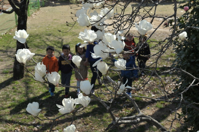 25일 전남 광양시 금호동 포스코 광양제철소 어린이집 놀이터에서 어린이들이 봄의 전령인 백목련을 바라보고 있다. 광양제철소와 금호동 주택단지에는 해마다 봄철 개나리, 매화, 벚꽃 등 꽃들이 만개해 나들이객들이 줄을 잇고 있다. (사진제공=광양제철소)