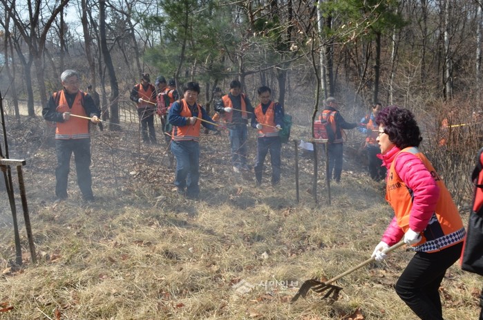 서울 강남소방서는 지난 24일 대모산에서 '봄철 화재대비 산불진압훈련'을 실시했다. 이날 소방공무원과 의요소방대원 100여명이 훈련에 참여했다. 사진은 훈련에 참여한 관계자들이 등진펌프를 메고 진압훈련을 진행 중인 모습. (사진제공=강남소방서)