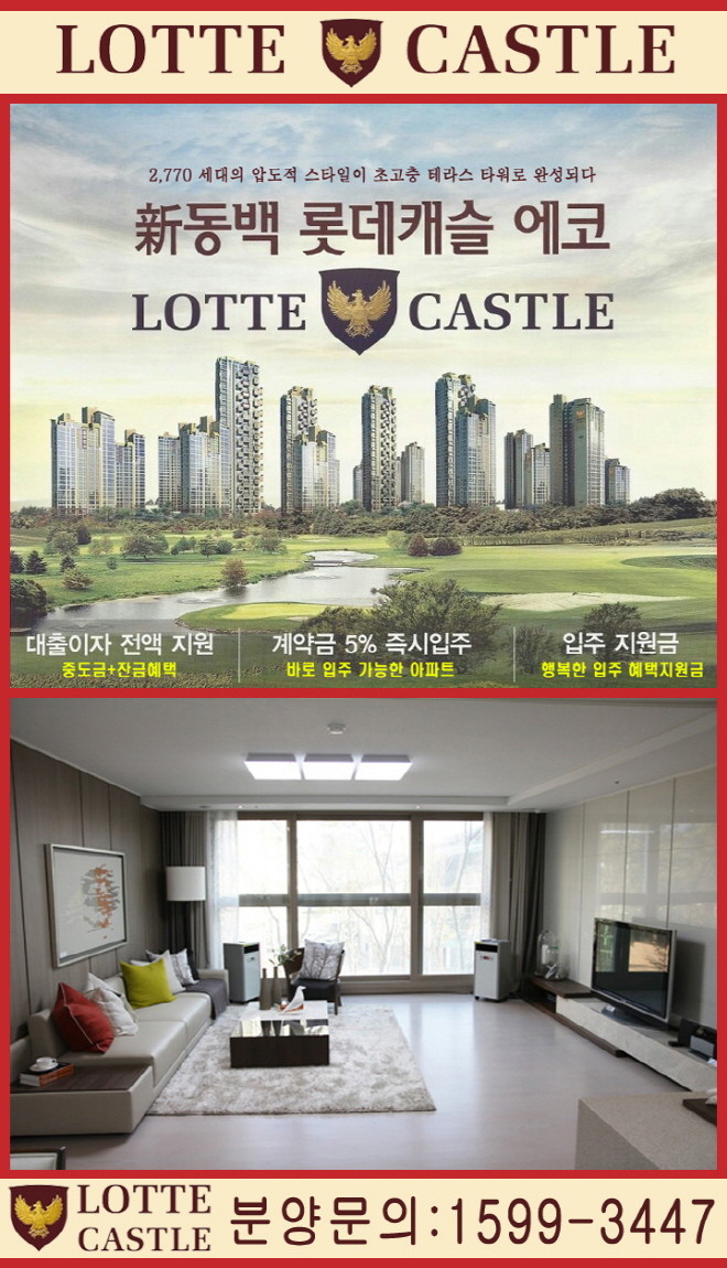 특히, 신동백 롯데케슬 에코 아파트는 DTI-LTV 규제완화와 금리인하, 9.1부동산대책 등 부동산 살리기에 강한 드라이브를 걸고 있는 새 경제팀에 대한 기대감으로 관망세에 있던 대기수요자들에게 좋은 반응을 얻고 있다. 파격적인 혜택으로 선착순 특별분양을 실시하면서 실수요자와 투자자들이 몰리고 있다.