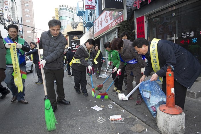 지난 25일 서울 은평구가 연신내역 인근에서 실시한 ‘새봄맞이 대청소’에 참가한 김우영 구청장(왼쪽에서 두 번째)이 주민, 구청직원과 함께 연신내 번화가 골목길을 청소하고 있다. (사진제공=은평구청)