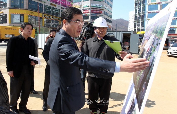 양기대 경기 광명시장은 26일 봄철 해빙기를 맞아 소하시립도서관 건설공사 현장 등 주요 공사장을 찾아 공사 진척 브리핑을 듣고, 관계자들에게 안전에 최선을 다해 줄 것을 당부했다. 사진은 양기대 시장(가운데)이 공사 진척 브리핑을 듣고 있는 모습. (사진제공=류만옥 기자)