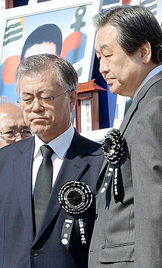 새누리당 김무성(오른쪽) 대표와 새정치민주연합 문재인 대표가 26일 오전 국립 대전현충원에서 열린 천안함 용사 5주기 추모식에 참석해 헌화를 마치고 자리로 이동하고 있다.