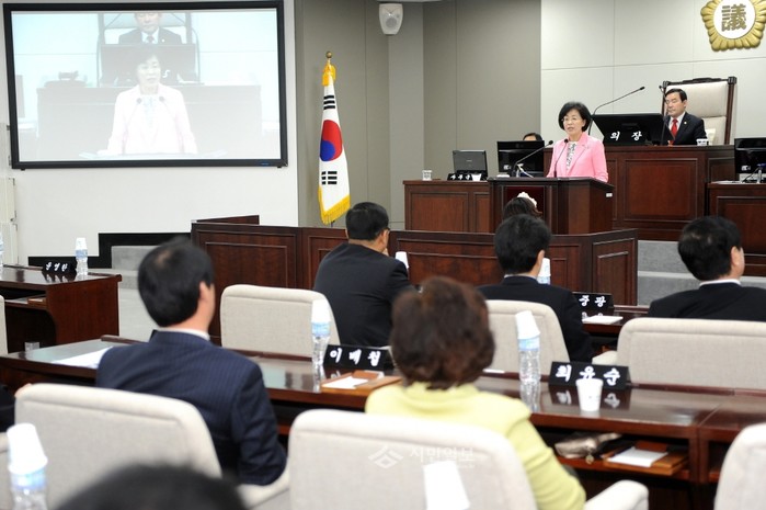 지난 26일 서울 송파구의회 4층 본회의장에서 열린 '제228회 구의회 임시회 2차 본회의'에서 박춘희 송파구청장이 의원들의 구정질문에 대한 답변을 하고 있다.(사진제공=송파구청)