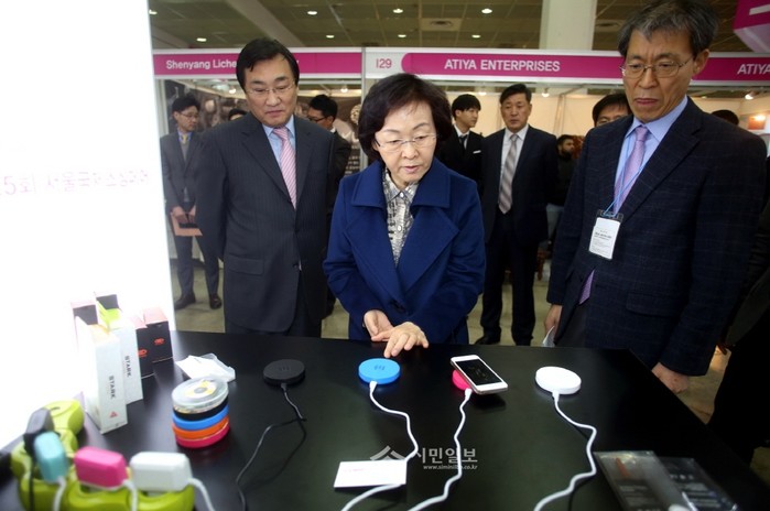 지난 26일 서울 강남구 코엑스에서 열린 '서울국제소싱페어'에 참여한 15개 기업의 부스를 방문한 신연희 구청장이 깜찍한 디자인의 무선충전기 제품을 살펴보고 있다. (사진제공=강남구청)