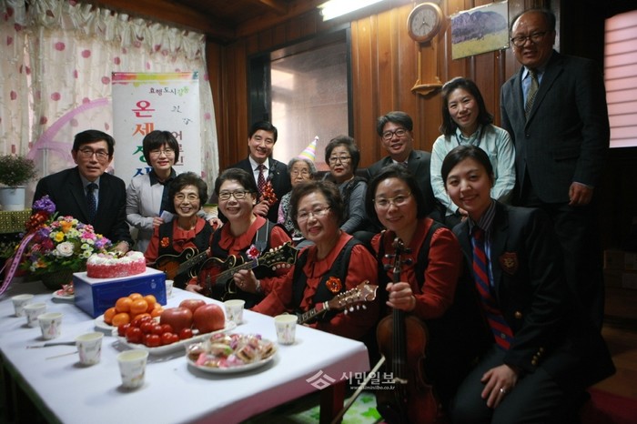 서울 강동구가 노인 복지증신 사업의 일환으로 최근 100세 노인을 대상으로 생신잔치를 해드리는 '온세상 생신축하연'을 진행했다. 사진은 이날 봉사자들이 고덕동에 거주하는 한 노인의 집에 방문해 생일을 축하하고 있는 모습. (사진제공=강동구청)
