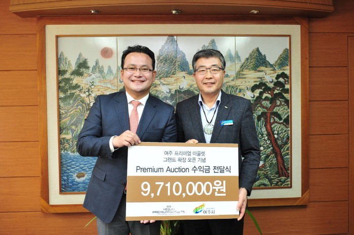 (주)신세계사이먼 여주 프리미엄아울렛 허영무 점장은 최근 경기 여주시 시청을 방문해 앞서 열린 여주 프리미엄아울렛 확장 오픈기념 경매 이벤트에서 얻은 수익금 971만원을 지역내 저소득층 지원을 위해 전액 기탁했다. 사진은 기탁식 후 기념촬영 중인 원경희 여주시장과 허 점장(오른쪽부터)의 모습. (사진제공=여주시청)