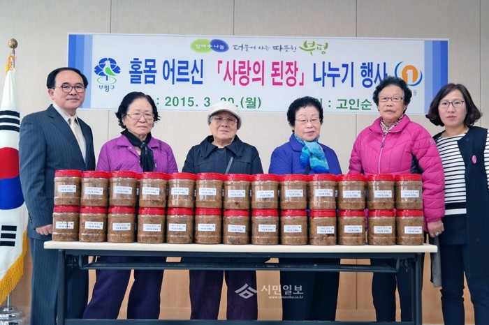 인천 부평구 부평1동 주민센터는 지난달 30일 고인순씨(85)가 맡겨온 된장 100kg을 지역내 홀몸노인 50가구에 전달했다. 고씨는 매년 직접 담은 된장을 주민센터를 통해서 지역내 어려운 이웃과 나누고 있다. 사진은 된장을 전달받은 노인들이 된장과 함께 기념촬영한 모습. (사진제공=부평구청)