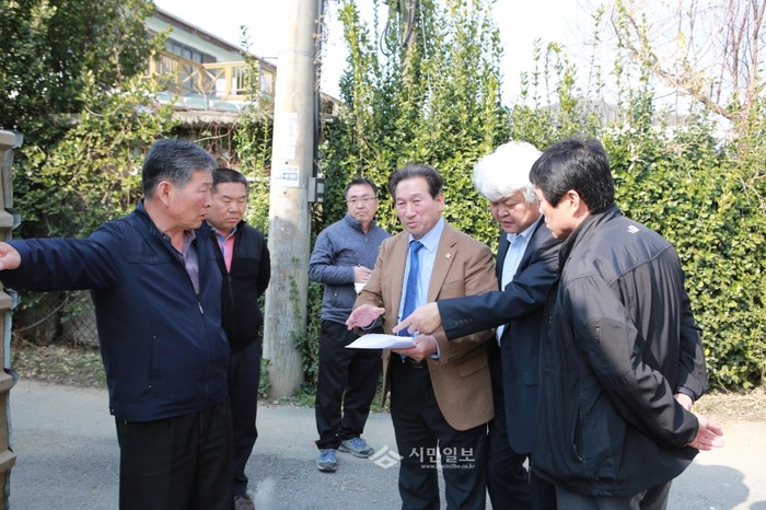 경기 평택시의회 오명근 의원이 최근 팽성읍 평궁2리를 찾아 현장 점검을 진행했다. 이날 점검에서 오 의원은 마을회관 건립에 대한 주민 의견을 듣는 시간을 가졌다. 사진은 오 의원(가운데)이 관계자들과 이야기를 나누고 있는 모습. (사진제공=평택시청)