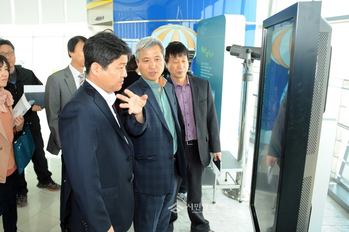 경기 오산시가 지난 3월30일 '오산시 혁신교육 우수사례'를 벤치마킹을 위해 시를 방문한 서울 성북구와 현장방문을 실시했다. 이번 벤치마킹에는 곽상욱 오산시장을 비롯, 김영배 성북구청장과 관계자들이 참석했다. 사진은 곽 시장(가운데)과 김 구청장(왼쪽)이 오산천에 위치한 에코리움을 현장 방문한 모습. (사진제공=오산시청)