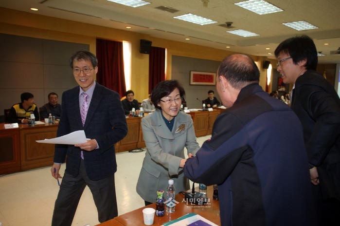 신연희 서울 강남구청장이 지난달 30일 구청에서 열린 '소상공인 지원사업 설명회'에 참석해 상공인들을 위로하고 지원정책 마련을 약속했다. 사진은 신연희 구청장(가운데)이 상공인들과 인사를 나누고 있는 모습. (사진제공=강남구청)