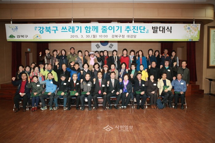 서울 강북구가 지난 30일 구청 대강당에서 '쓰레기 함께 줄이기 추진단' 발대식을 가졌다. 이날 발대식에는 추진단원 262명이 참석해 위촉장을 받았다. 사진은 박겸수 강북구청장(앞줄 가운데)이 단원들과 기념촬영한 모습. (사진제공=강북구청)