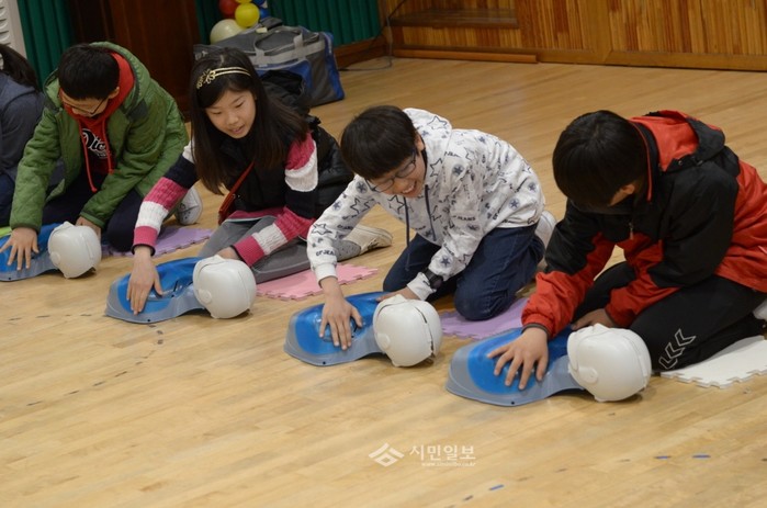 서울 영등포소방서가 지난달 31일 영등포구 영중초등학교에서 5학년 학생 및 교직원들을 대상으로 화재안전교육을 실시했다. 이날 교육은 학생들이 할 수 있는 심폐소생술과 자동심장충격기 사용법 등에 대해 진행됐다. 사진은 한 학생이 심폐소생술을 진행 중인 모습. (사진제공=영등포소방서)