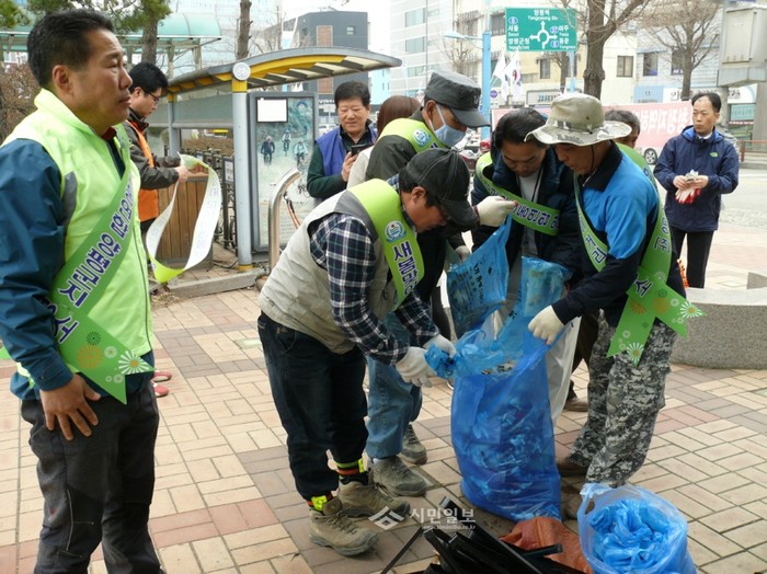 사단법인 환경보호운동연합 양평군지부는 지난달 31일 오전 후손에게 깨끗한 환경을 물려주자는 취지에서 1시간에 걸쳐 새봄맞이 거리대청소를 실시했다. 사진은 관계자들이 쓰레기를 정리하고 있는 모습.(사진제공=양평군청)