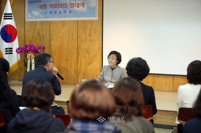 신연희 서울 강남구청장이 지난달 31일 강남구 대청중학교에서 학부모들과 공교육에 대한 문제점, 지원방향 등에 대해 대화를 나누는 '학교사랑방'에 참석했다. 사진은 신연희 구청장(가운데)이 주민의 질문에 경청하고 있는 모습. (사진제공=강남구청)