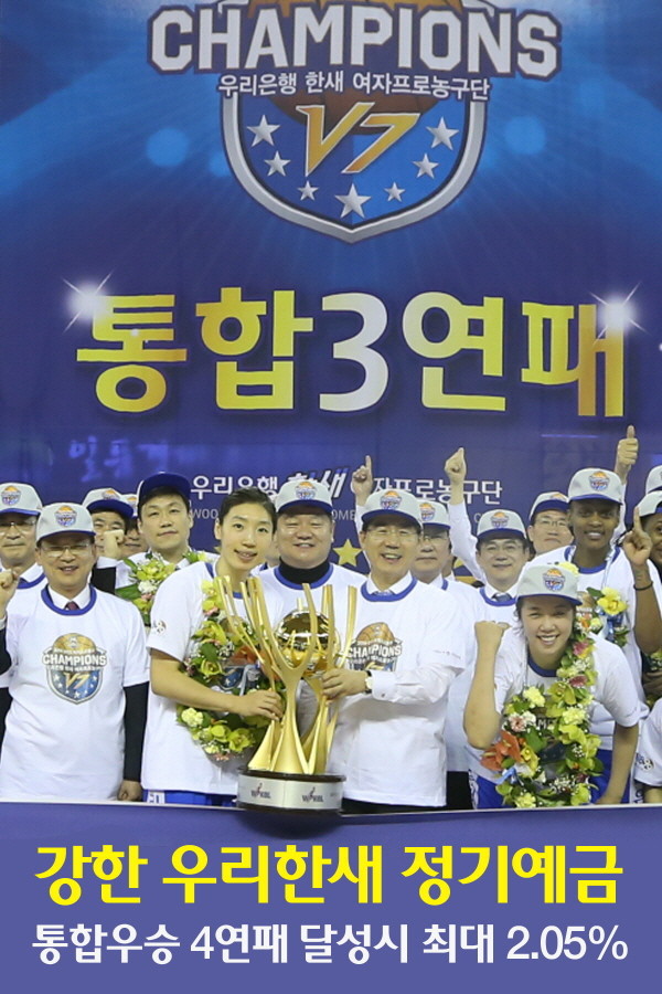 [시민일보=고수현 기자]우리은행(은행장 이광구, www.wooribank.com)은 소속 여자프로농구단인 한새농구단의 통합우승 3연패와 챔피언결정전 7회 우승을 기념하고, 팬과 고객의 성원에 보답하는 의미에서 우대금리 및 경품을 제공하는 '강한 우리한새 정기예금'을 오는 30일까지 1조원 한도로 판매한다고 1일 밝혔다.