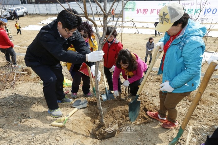 경기 부천시가 최근 복사꽃생활공원 조성지에서 내나무 심기 행사를 진행했다. 이날 행사에는 시민, 단체 등 500여명이 참석해 꽃 복숭아 나무 700주를 심었다. 사진은 참여자들이 꽃 봉숭아 나무를 심고 있는 모습. (사진제공=부천시청)