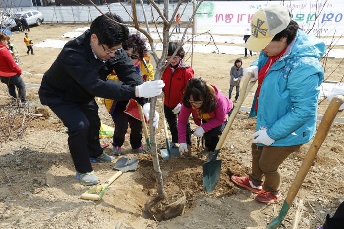 경기 부천시가 최근 복사꽃생활공원조성지에서 내나무 심기 행사를 진행했다. 이날 행사에는 시민, 단체 등 500여명이 참석해 꽃 복숭아 700주를 심었다. 사진은 참여자들이 꽃 봉숭아 나무를 심고 있는 모습. (사진제공=부천시청)