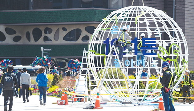 1일 오후 서울광장에서 환경부 관계자들이 온실가스줄이기 1인 1톤 조형물을 제작하고 있다. 환경부는 오는 3일 오전 서울광장에서 이 조형물 제막식을 연다.