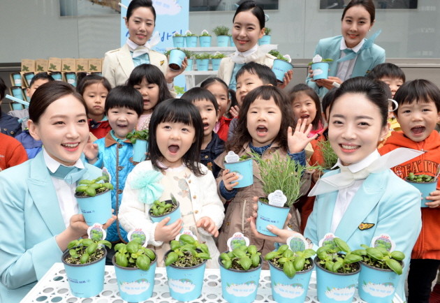 식목일을 앞둔 2일 오전 서울 중구 대한항공 서소문 사옥 앞에서 열린 꽃씨 나눔 행사에서 대한항공 직원들이 어린이들에게 스위트바질 꽃씨 및 화분을 직접 나눠주며 환하게 웃고 있다.