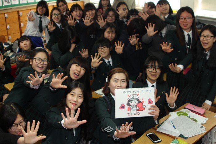 인천 강화경찰서 학교전담 경찰관이 지난 1일 만우절을 맞이해 강화여자중학교를 방문해 만우절 허위신고 금지 및 학교폭력 예방 메시지가 담긴 편지 읽어주기, '학교폭력 멈춰!' 홍보물 나눠주기 등의 이벤트를 실시했다. 사진은 학교전담 경찰관(가운데)과 학생들이 기념촬영한 모습. (사진제공=강화경찰서)