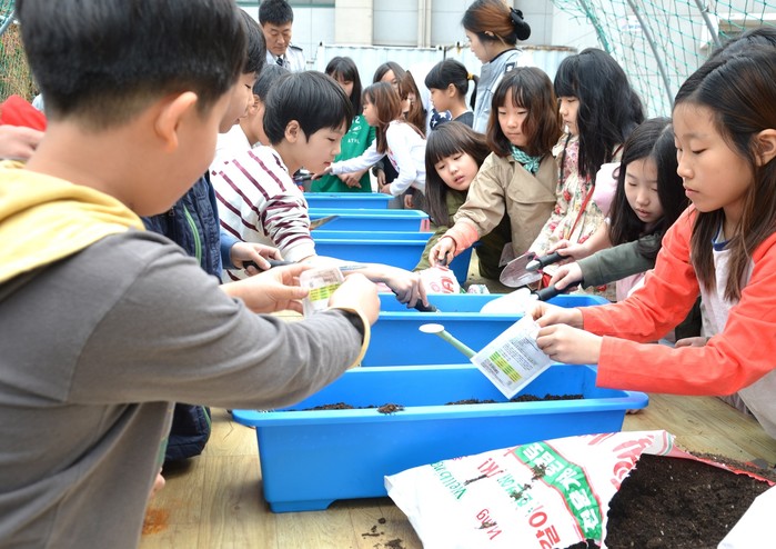 인천 중부경찰서가 최근 송현초등학교에서 학생들과 함께 학교 폭력 예방 스티커가 붙은 꽃씨봉투에 담긴 꽃씨를 심는 '우정의 꽃심기' 체험캠페인을 진행했다. 사진은 이날 캠페인에서 학생들이 화분에 꽃씨를 심고 있는 모습. (사진제공=중부경찰서)