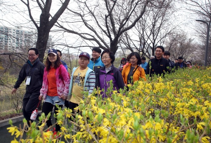 지난 4일 서울 강남구 양재천(영동 6교~영동 4교)에서 열린 ‘강남 7540 양재천 벚꽃길 걷기축제’에 참가한 신연희 구청장(오른쪽 앞에서 두 번째)가 지역주민들과 함께 양재천을 걷고 있다.(사진제공=강남구청)