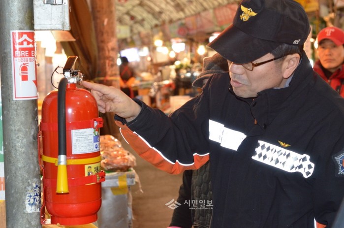 서울 영등포소방서는 해빙기를 맞아 지역내 전통시장과 전통시장의 상인에게 점포내 숨어 있는 소화기를 찾아 잘 보이는 곳에 소화기를 설치하고, 소화기 사용법과 화재발생시 행동요령 등을 교육하는 행사를 실시했다. 사진은 한 소방관이 소화기를 살펴보고 있는 모습. (사진제공=영등포소방서)