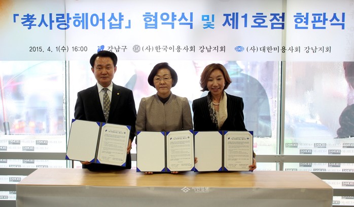 신연희 서울 강남구청장이 지난 1일 강남구 신사동 소재 헤어숍에서 열린 '효사랑 헤어숍 협약 및 현판식'에 참석했다. 사진은 신연희 구청장(오른쪽에서 네 번째)이 효사랑 헤어숍 현판식에 참석해 기념촬영하고 있는 모습. (사진제공=강남구청)