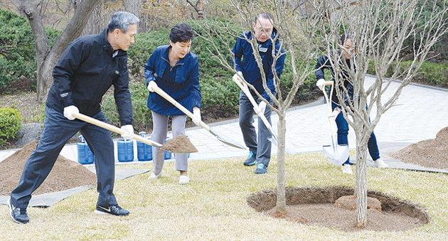 박근혜 대통령이 5일 오전 제70회 식목일을 맞아 참모들과 함께 청와대 경내 녹지원에서 기념식수를 하고 있다. 취임 후 매년 식목일에 기념식수를 해 온 박 대통령은 올해 광복 70주년을 기념한다는 의미에서 무궁화를 심었으며 이는 나라사랑의 마음을 되새기는 의미라고 청와대는 설명했다.