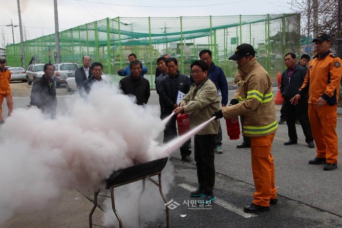 경북 구미소방서는 최근 봄철 주택화재로 인한 인명·재산피해를 줄이기 위한 '화재없는 안전마을' 대표자 간담회를 개최했다. 이날 간담회에는 마을 대표자들이 참석해 소방안전교육을 받았다. 사진은 간담회 참석자가 소방관의 도움을 받아 소화기 사용법을 배우고 있는 모습.(사진제공=구미소방서)