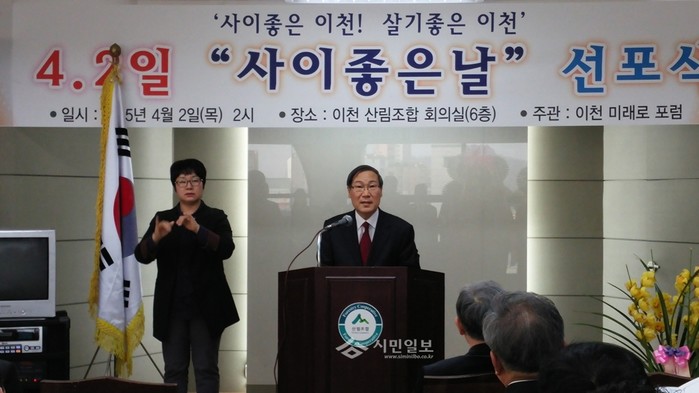 경기 이천 미래로포럼은 지난 2일 이천시 산림조합 회의실에서 '사이 좋은 날' 선포식을 개최했다. '사이 좋은 날' 선포식에 참석한 심윤수 이천 미래로포럼 대표가 기념사를 하고있다. (사진제공=이천시청)
