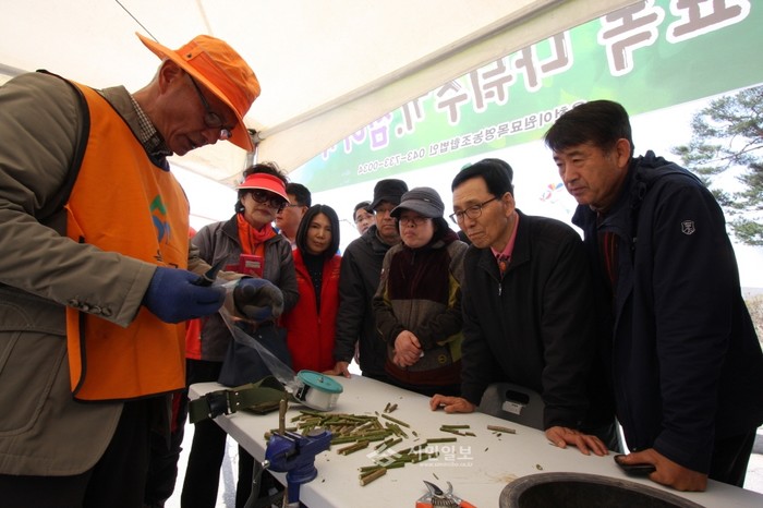 충북 옥천군이 최근 '제16회 옥천묘목축제'를 개최해 참여 주민들에게 다양한 묘목 체험행사를 제공했다. 사진은 주민들이 축제에서 묘목 접붙이기 체험을 하고 있는 모습. (사진제공=옥천군청)