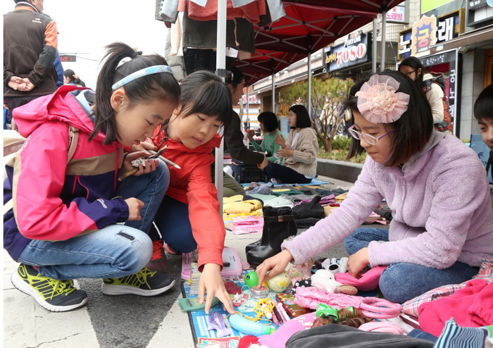 대전 대덕구가 지난 4일 중리행복 벼룩시장을 올해 첫 개장했다. 주민들은 직접 집안의 생활용품과 옷, 도서 등을 가지고 나와 판매했다. 사진은 이날 시장에서 자신의 물건을 가지고 나와 판매 하고 있는 어린이와 이를 구입하고 있는 어린이들의 모습. (사진제공=대덕구청)