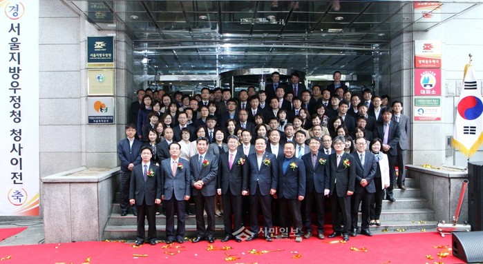 서울 종로6가에 위치한 광화문우체국 청사 앞에서 7일 오전 '서울지방우정청 현판식'이 열렸다. 사진은 김영수 서울지방우정청장(첫줄 왼쪽에서 네 번째)과 직원들이 광화문우체국 청사 앞에서 현판식을 마친 뒤 기념촬영 하고 있는 모습. (사진제공=서울지방우정청)