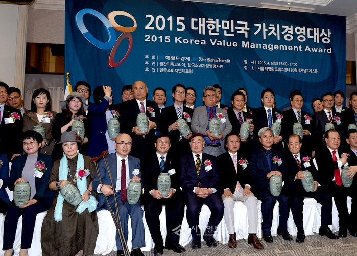 김성환 노원구청장(앞줄 왼쪽에서 네 번째)이 지난 6일 오후 3시 서울프레스센터 20층 내셔널프레스룸에서 열린 '2015 대한민국 가치경영대상' 시상식에 참석해 지방자치 부문 수상 후 수상자들과 함께 기념촬영을 하고 있다. (사진제공=노원구청)