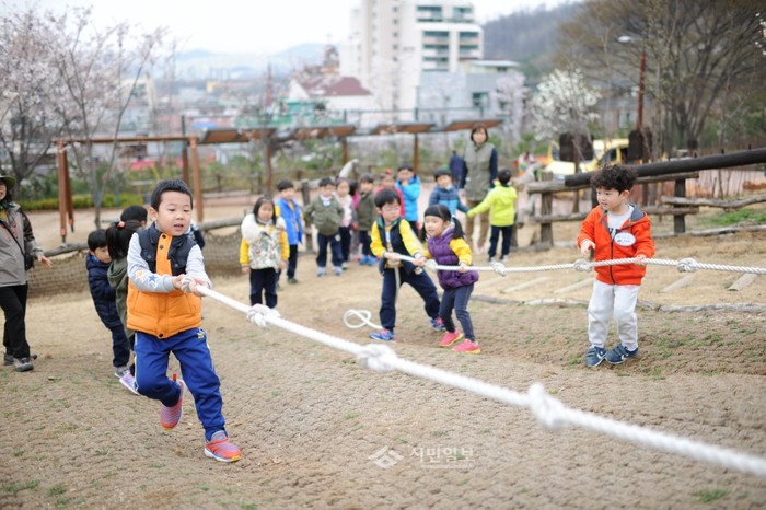 서울 중랑구는 최근 용마산내에 유아숲 체험장을 개장했다. 체험장에서는 다양한 자연생태 체험 프로그램이 운영 중에 있다. 사진은 숲체험장을 찾은 어린이들이 줄다리기 체험하고 있는 모습. (사진제공=중랑구청)