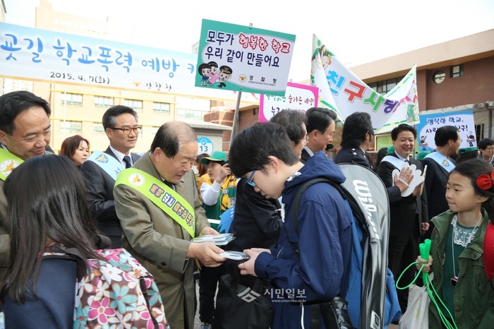박홍섭 서울 마포구청장(왼쪽에서 두 번째)이 지난 7일 오전 공덕초등학교에서 열린 '학교폭력 예방캠페인'에 참석해 등교하는 학생들에게 홍보물을 나눠주고 있다. (사진제공=마포구청)