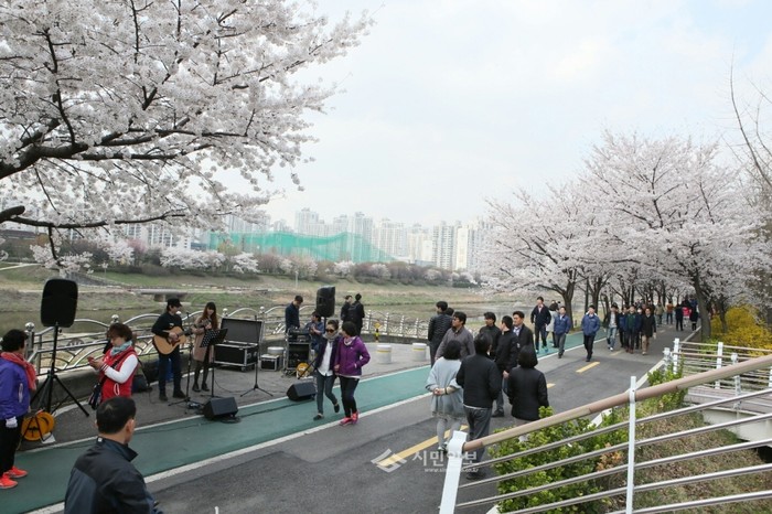 서울 금천구는 지난 8일 낮 12시 벚꽃이 만개한 안양천에서 직장인들과 지역 주민을 위한 런치콘서트를 열었다. 사진은 점심식사를 마치고 안양천 벚꽃길을 찾은 직장인들과 벚꽃나들이를 나온 주민들이 즐거운 시간을 보내는 모습. (사진제공=금천구청)